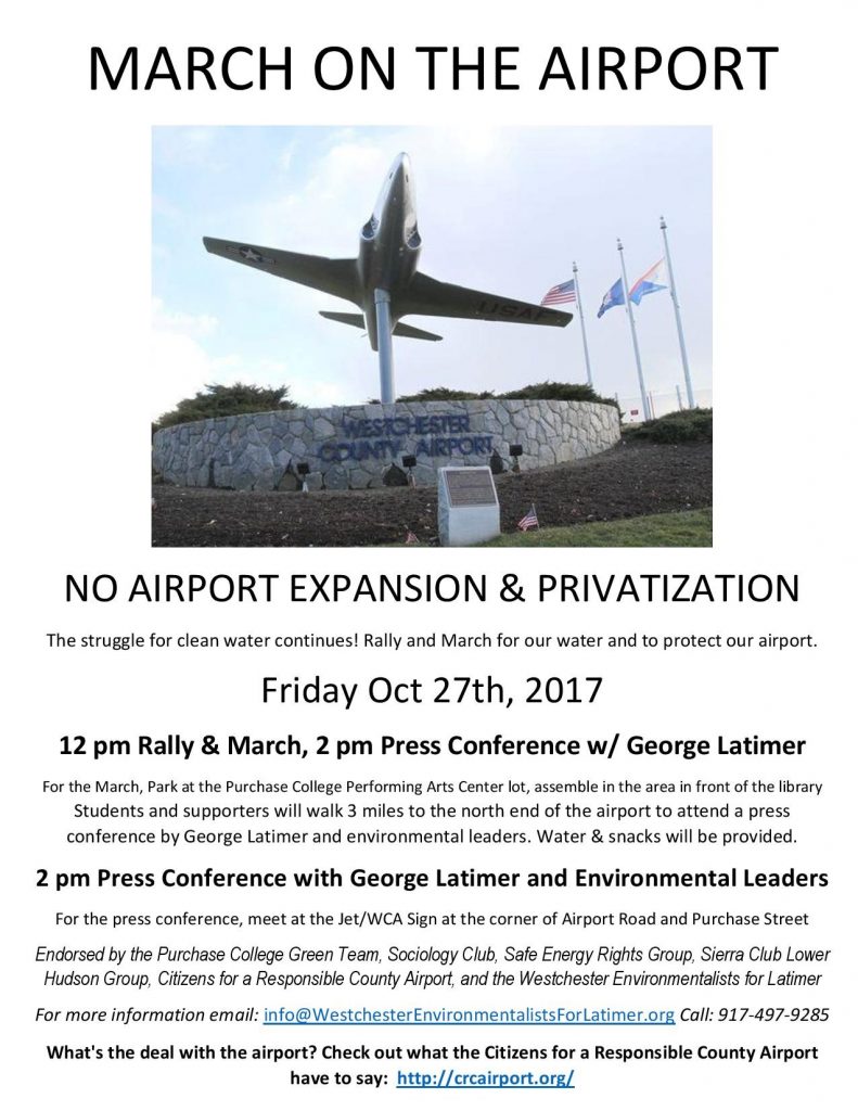 The press conference will be at the mounted jet at the northern end of Westchester County Airport, at the corner of Airport Road and Purchase Street. We believe it is safe to park on the shoulder of Purchase Street. Alternatively, you can join us for a 12pm rally at Purchase College and march to the airport press conference.